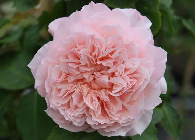 Herbloeiende klimroos met zeer grote gevulde nostalgische zachtroze bloemen met een intens fruitige geur